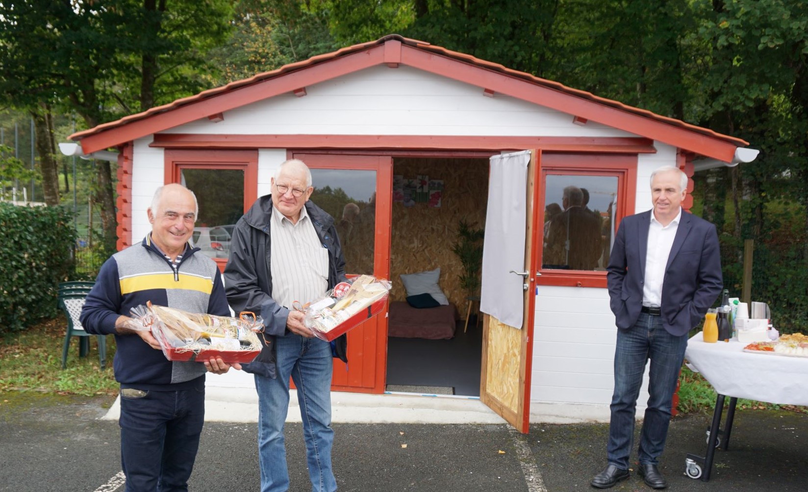 Mais ce beau projet n’aurait pas pu se concrétiser sans l’aide de deux bénévoles au grand cœur : Pierre Fordin et Daniel Petrissans, tous deux membres du Conseil de la vie sociale d’Harriola, qui ont mis leur savoir-faire et donné de leur temps pour construire entièrement le chalet et transformer un modeste cabanon en un espace confortable et douillet. Montage, isolement, étanchéité, revêtement du sol, peinture : ce ne fut pas une mince affaire mais tous deux ne peuvent qu’être fiers du résultat. Félicités par M. le Maire pour le travail accompli ; leur générosité a également été remerciée par tout le personnel de la maison de retraite qui leur a offert de beaux paniers garnis.