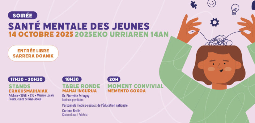 La commune de Saint-Pierre-d’Irube/Hiriburu et le collège Aturri organisent, en partenariat avec plusieurs acteurs du territoire, une soirée dédiée à la santé mentale des jeunes le mardi 14 octobre. Un moment d’échanges et de sensibilisation La santé mentale des jeunes est aujourd’hui une préoccupation majeure pour les familles, les établissements scolaires et les professionnels de […] En savoir plus Soirée santé mentale des jeunes au Collège Aturri