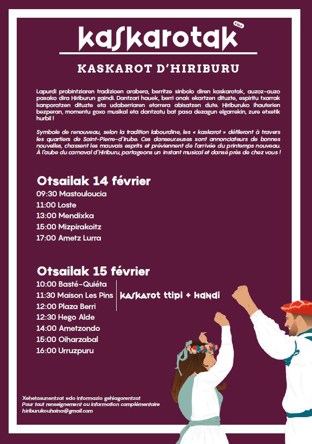 🎉 Lapurdi probintziako tradizioen arabera, berritze sinbolo diren kaskarotak, auzoz-auzo pasako dira Hiriburun gaindi. Dantzari hauek, berri onak ekartzen dituzte, espiritu txarrak kanporatzen dituzte eta udaberriaren etorreraz abisatzen dute. Hiriburuko ihauterien bezperan, momentu goxo musikal eta dantzatu bat pasa dezagun elkarrekin, zure etxetik hurbil!